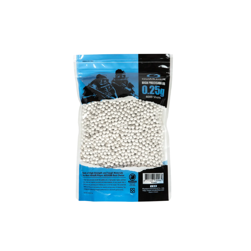 Precizní a velmi oblíbené kuličky Guarder o hmotnosti 0.25g. V 1 sáčku je 4000 kuliček. Kuličky Guarder jsou precizně provedené, mají perfektně kulatý tvar a hladký povrch.