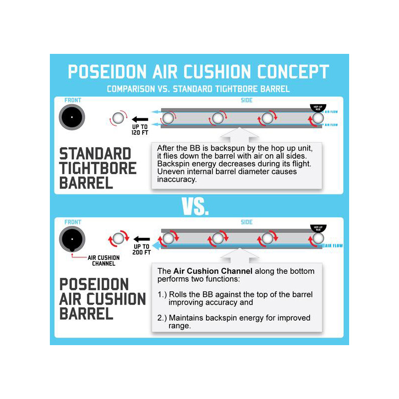 Všechny hlavně Poseidon Air Cushion jsou vybaveny novým unikátním designem vnitřního vrtání Air Track, který vytváří optimální vzduchový polštář kolem kuličky, a umožňuje tak kuličce procházet hlaveňí vyšší rychlostí. V kombinaci s funkcí Air Relief Divergence (minimalizace turbulencí, které vznikají v okamžiku, kdy kulička opuští hlaveň) zajišťují optimální let a správnou trajektorii, stejně tak i bezkonkurenční dostřel a přesnost. Určeno speciálně pro vysoce výkonné airsoftové zbraně a hráče, kteří požadují to nejlepší.
