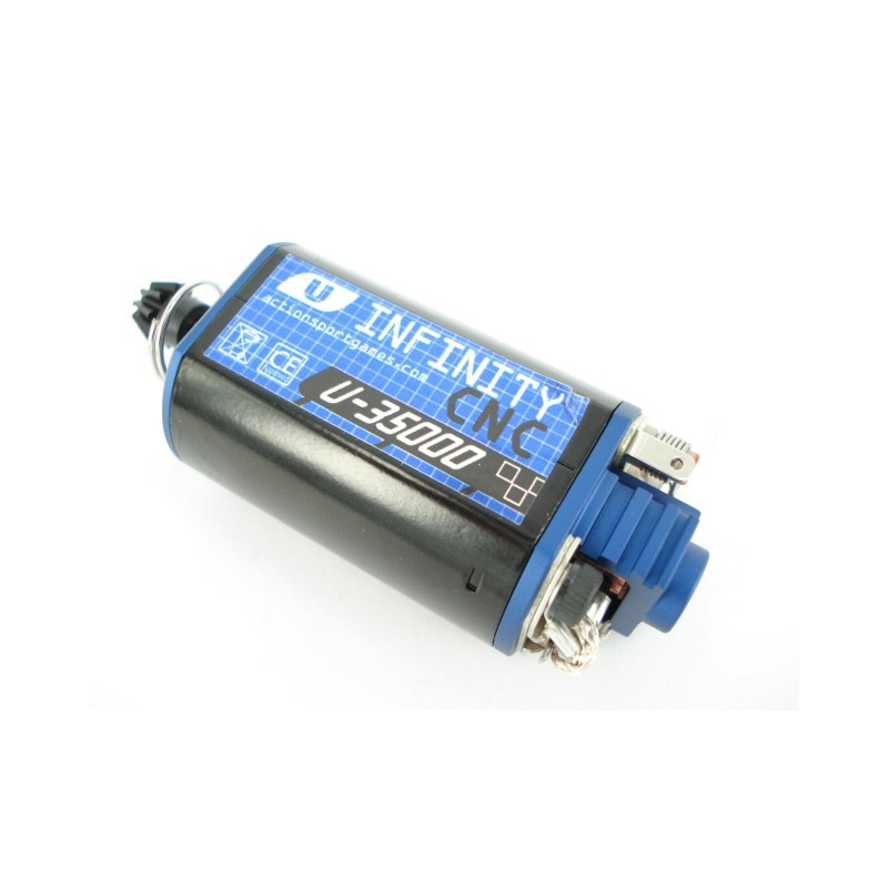 Ultimátní motor INFINITY CNC je navržený s důrazem na vysoký točivý moment a spolehlivost při použití různých pružin. Motor má CNC obráběné hliníkové víko, nerezovou hřídel, ocelový pastorek a vysoce kvalitní rotor s tepelně odolnými magnety. Díky uhlíkovým kartáčům a stříbřenému vodiči se můžete spolehnout na skvělý výkon i při delším používání. Oproti modelů BOOST nabízí CNC hliníkové tělo i patku, což má za výsledek perfektní odvod přebytečného tepla. Kuličková ložiska se postarají o stabilizaci hřídele a hladký chod. Samozřejmostí je CNC ocelový pastorek a nerezová hřídel odolná vůči opotřebení.