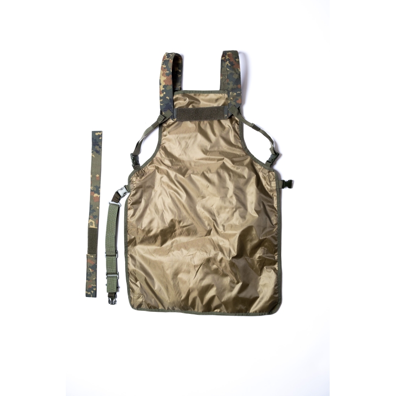 Zástěra se nosí velmi pohodlně i zatížená díky ramennímu postroji (harness) ve tvaru písmena H.