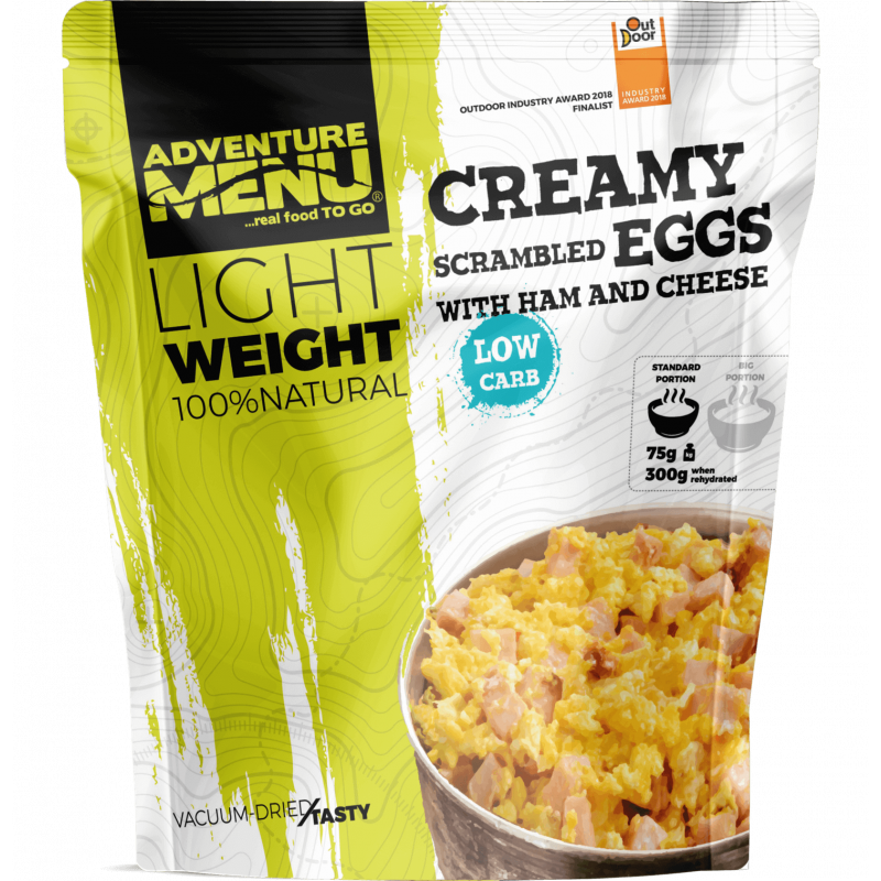 Lightweight Krémová míchaná vajíčka se šunkou a sýrem jsou ideálním startem dne pro každého airsoftového hráče. Lehká, výživná a rychle připravitelná. Prostě není nad pořádnou snídani! Vychutnej si poctivá míchaná vajíčka smažená na červené cibulce se šunkou a zjemněná smetanou a posypané sýrem Gouda. Po téhle snídani tě nic nezastaví!