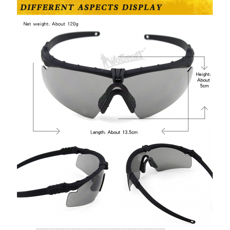 WoSporT ochranné střelecké brýle MA-69 s tmavým zorníkem a pískovým rámem poskytují spolehlivou ochranu zraku při airsoftu i na střelnici. Lehká konstrukce, UV ochrana a odolný polykarbonátový zorník zajišťují pohodlí i bezpečí během celé hry. Splňují normu ANSI Z80.3 s odolností skel přes 3 J (170 m/s).