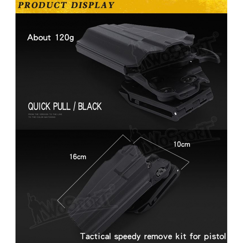 Quick Locking System Kit od WoSport v provedení černá je kopií QLS systému od Safariland. Nabízí možnost rychlého odepnutí pistolového pouzdra z jeho základny. Jištěno masivním plastovým trojzubcem. Nastavitelný sklon. Šrouby pro holster jsou součástí balení.
