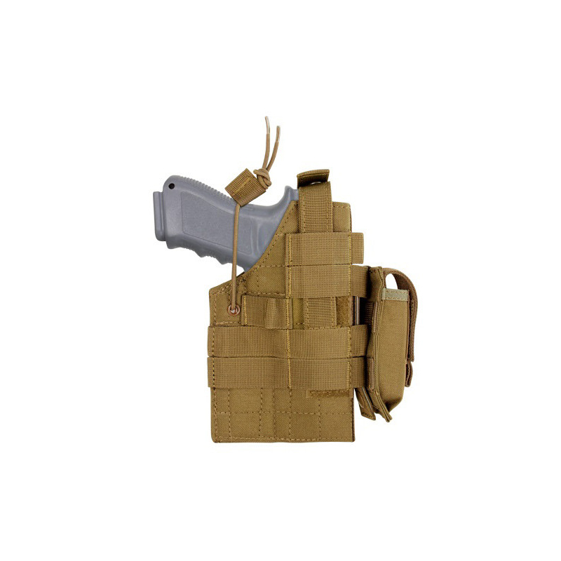 Zobrazit větší Pouzdro pro pistole Glock, modely 19-35 v rážích 9 mm, .40 S&W a .45 GAP. Pro připevnění na MOLLE systém, lze na pravou i levou stranu. Zajištění zbraně pomocí pásku se zapínáním na patentku a elastické šňůry. Samostatná odepínací sumka na zásobník.