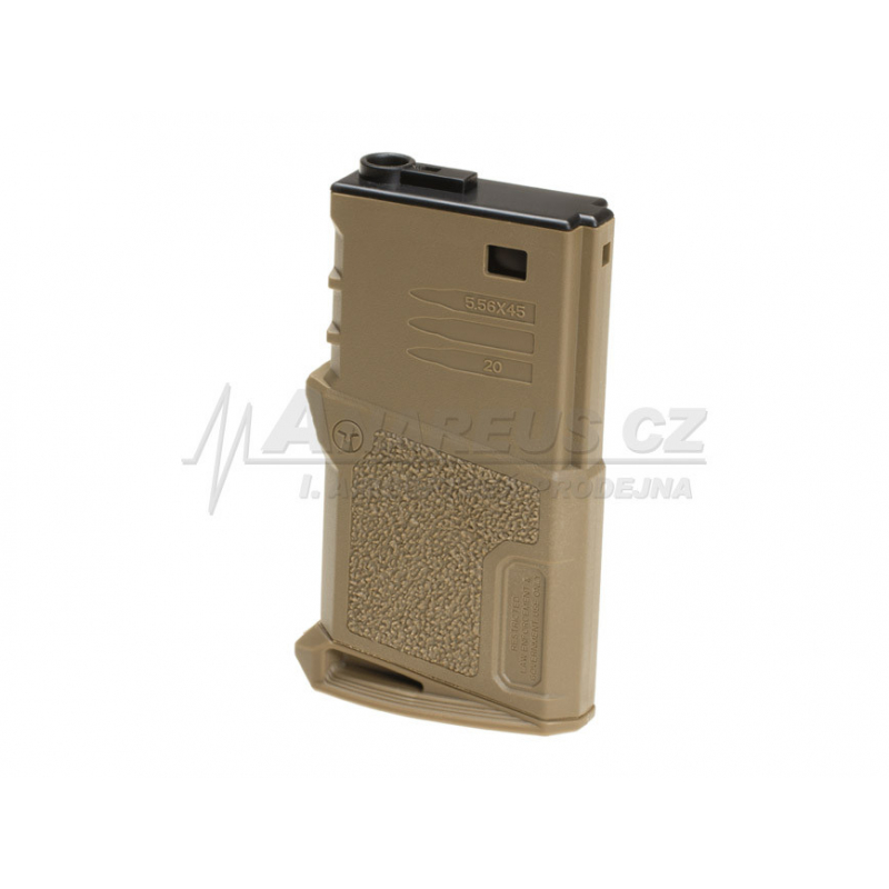 Inovativní zásobník firmy Ares z řady AMOEBA, zdrsnění povrchu proti vyklouznutí a drážky známe u zásobníků například magpul. Velmi přesné zpracování, navíc integrovaný rychlovytahovací pásek. Rozborka zásobníku přes velký imbus ve spodní části zajišťuje snadnou udržbu a čištění.
