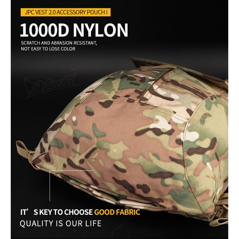 Multifunkční batoh pro vestu typu JPC značky Wosport, který snadno pojme vaše vybavení a budete tak mít při hře vše u sebe. Batoh je vyroben z odolného nylonu 1000D a v jeho vnitřní části najdeme velký úložný prostor, kapsy ze síťoviny a elastické popruhy pro zajištění vašich věcí. Dostupný v několika barevných provedeních.