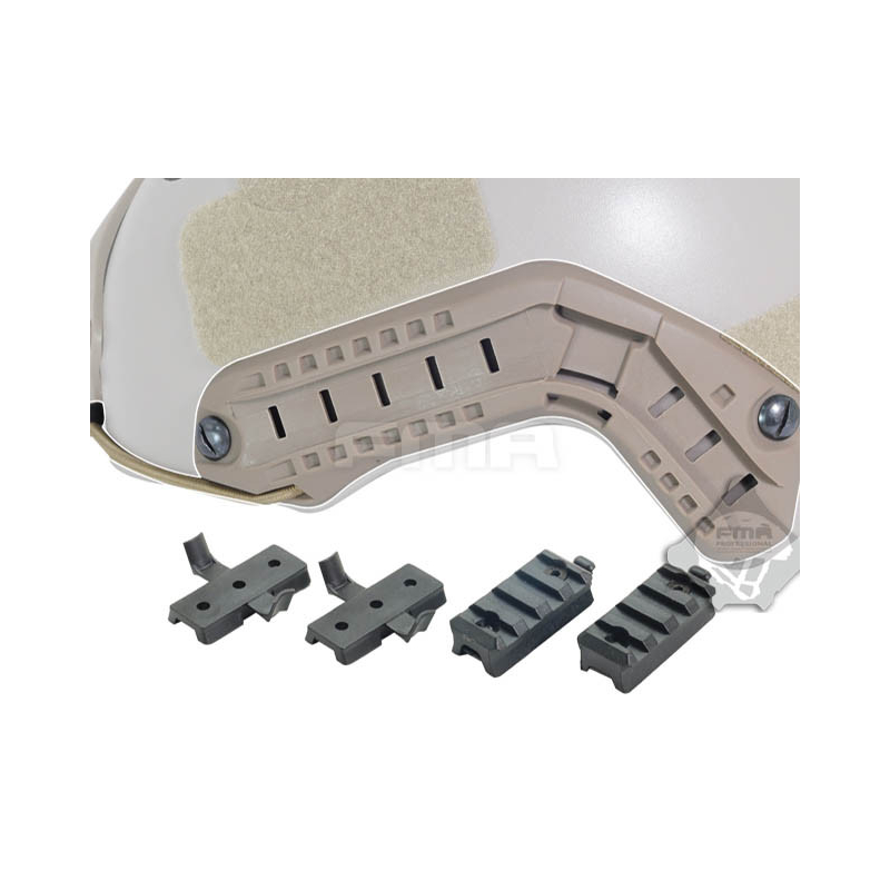 This set of ARC rails from FMA allows for the installation of various accessories on OPS FAST helmets and their replicas. The rails are designed for quick and easy installation on the sides of the helmet, enabling efficient attachment and cable management. The rails are compatible with ear protectors, headset adapters, ballistic goggles, and masks, allowing for full facial protection during activities such as airsoft.