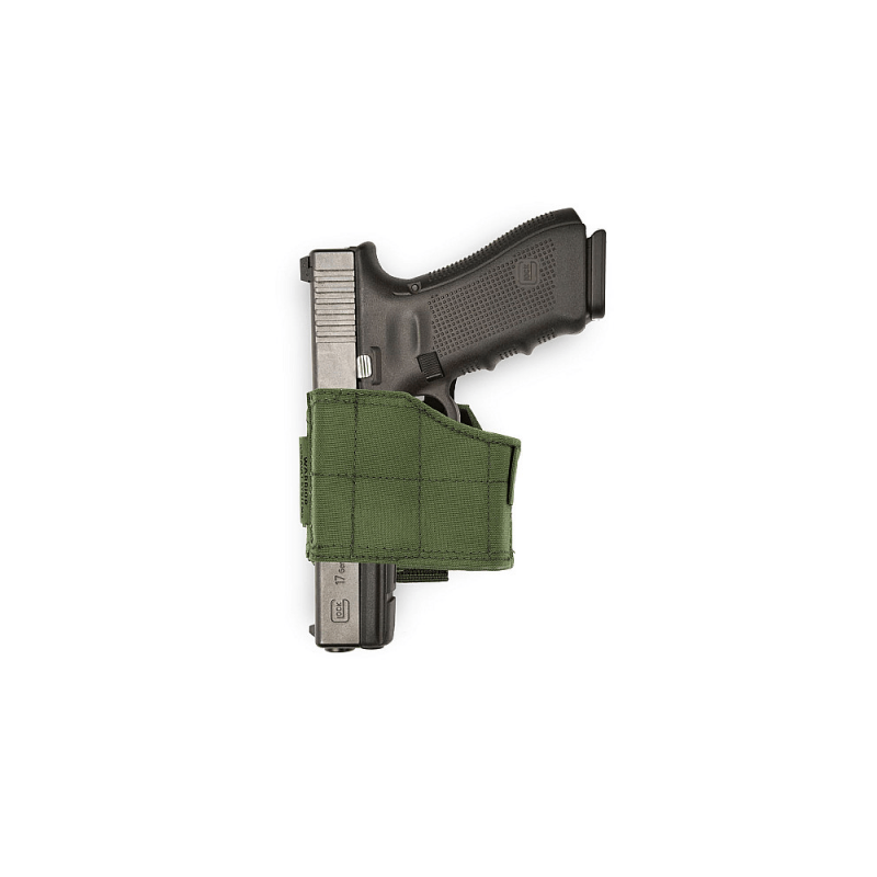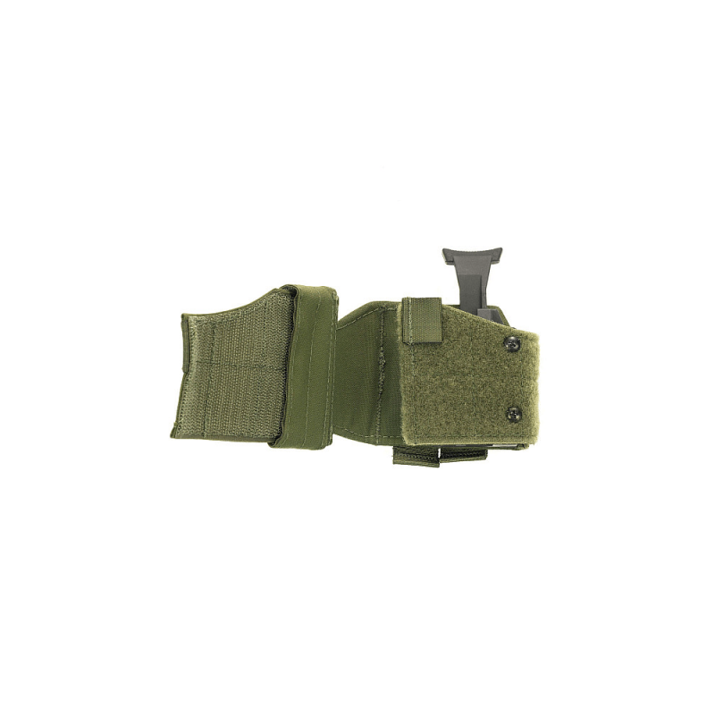 Adjustment is simple and quick by way of velcro closure. Sidearms are secured firmly by way of a moulded composite internal housing. The weapon is released by means of a push down thumb release.