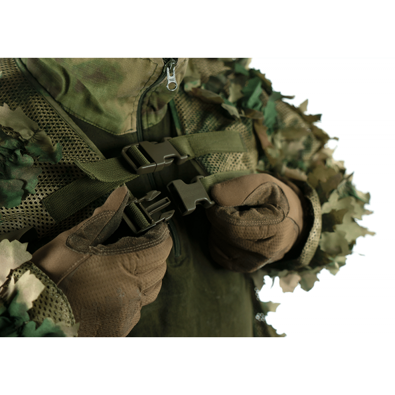 Two adjustable buckles make for a secure fit and allow taking off the Ghillie within seconds. The with of the waist can be adjusted as well so that you can fit it to your body shape. On top of that, the ends of the sleeves have an elastic adjustable cord sewed in to ensure that your sleeves stay down and cover up the back of your hands properly.
