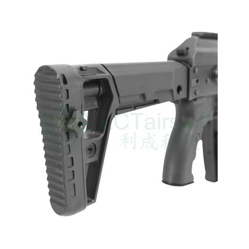 This model is equipped with a plastic stock which has a RIS rail on the underside for mounting front grips or accessories. The bolt cover is hingable with a top RIS rail.