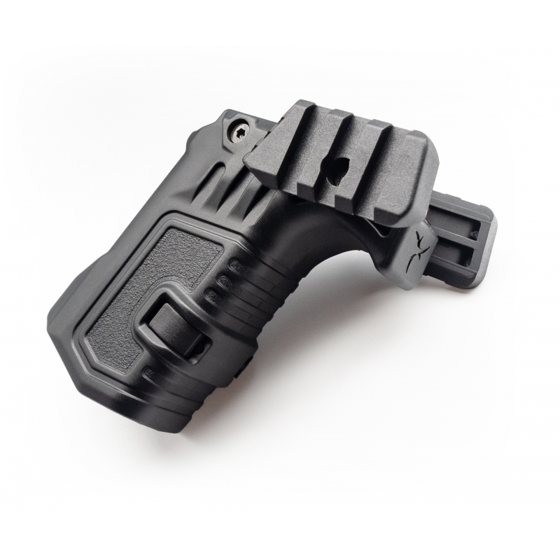 The tactical vertical grip with integrated magazine holder ensures you'll always have a spare magazine within reach, speeding up your reloads. Its design is tailored to fit AAP-01 magazines or G-series magazines from Tokyo Marui and compatible brands. It mounts onto a RIS rail, so if you're installing it on an AAP-01 pistol, you'll need a compatible M-LOK or RIS handguard or a standalone RIS rail. Naturally, it can be mounted to any other weapon equipped with a RIS rail or RIS handguard. The reinforced magazine catch securely holds even heavy CO₂ or extended 50-BB magazines. There are also two small RIS rails on the sides for attaching a flashlight or other accessories.