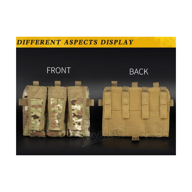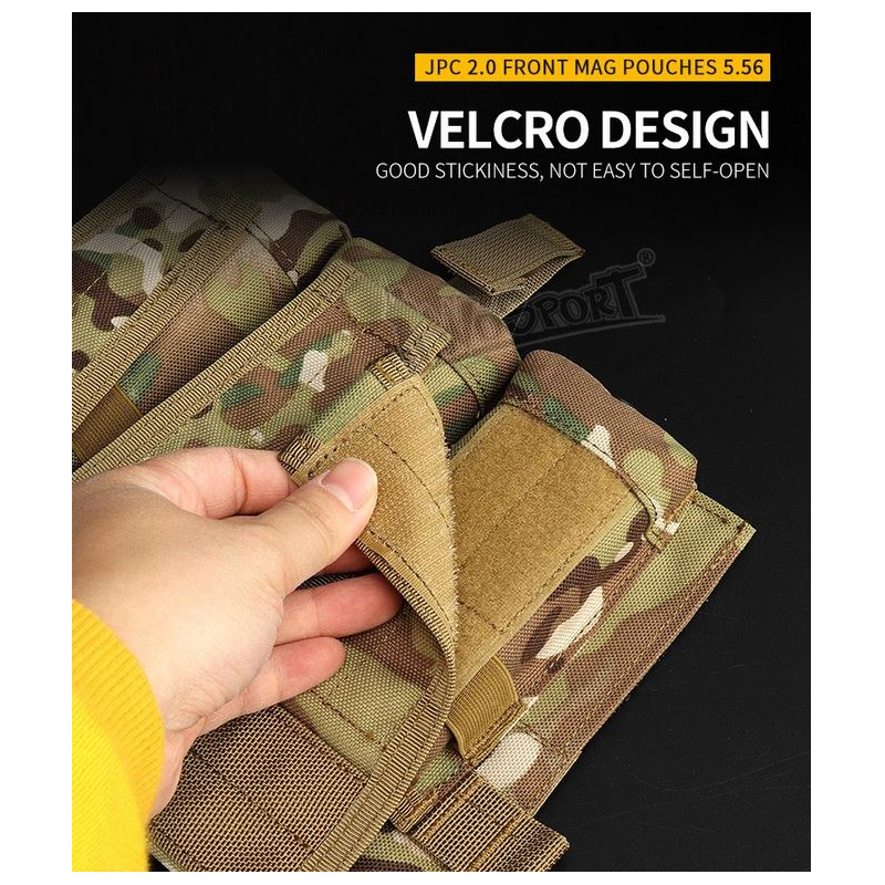 Front magazine platform for the JPC vest that holds three 5.56 magazines. The platform is made of 1000D nylon, which is lightweight and durable. The magazines are secured inside the pouches with Velcro closures, which means you won't lose them easily, even during the toughest games.