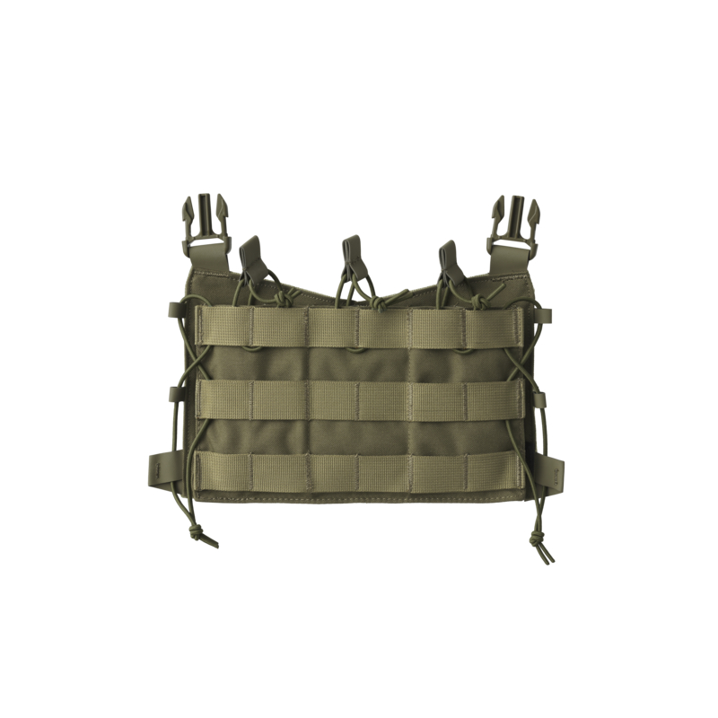 The magazines are secured by an elastic cord that ensures their stability while allowing quick access. The front of the platform is covered with MOLLE/PALS webbing, which allows for the attachment of additional gear. The platform attaches to the plate carrier using Fastex buckles and a back panel with Velcro, ensuring a secure and stable connection.