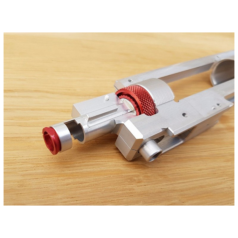 CNC split gearbox V2 designed for airsoft replicas AR15 (M4), M16 and other ones with V2 gearbox. This gearbox is manufactured from one solid block of aircraft aluminum (Dural) EN AW 7075 T651, which has higher strength (590MPa), than common construction steel (390MPa). Because of used material, our gearboxes have the best durability and resilience than common zinc-aluminum gearboxes. We are manufacturing these gearboxes on our precise CNC milling machines in our factory. Detail in bracket (8mm) means diameter for bushings/bearings.