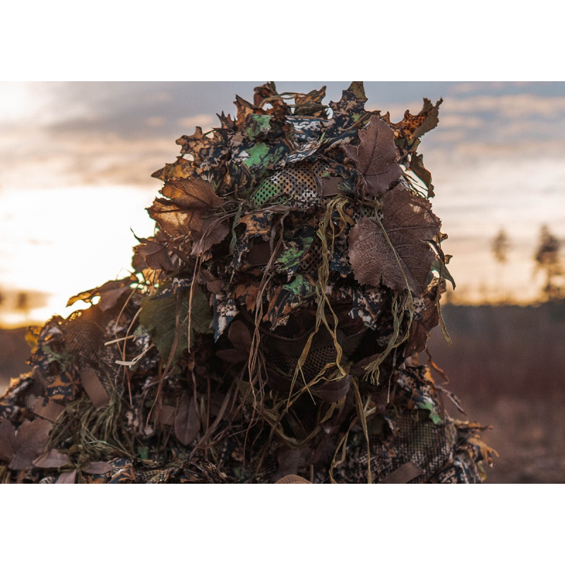 A practical camouflage hood that breaks the silhouette of your head and makes you an invisible part of the woods. The hood is breathable, lightweight and practical, as it will not obstruct your view. The 3D leaves have been designed so that they do not rustle. Thanks to the mesh, you can add additional camouflage to the hood. The colour correction was done by former military experts in Vienna.