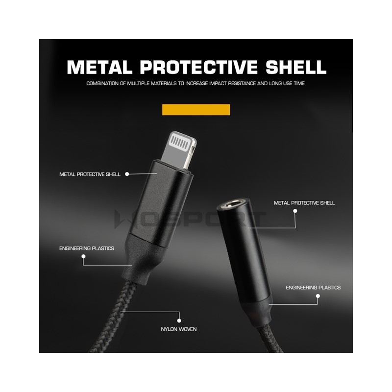 WoSporT Apple iPhone Lightning adapter for 3.5 mm Jack allows you to connect classic headphones or speakers to modern devices without an audio connector. A practical solution for phones and tablets with a Lightning connector. The adapter length is 120 mm and the cable features nylon braiding for increased durability.