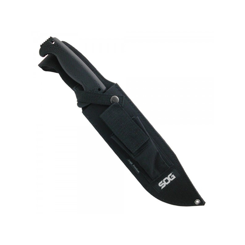 If all that separates us from them is equipment, it should be good. The Jungle Primitive, which uses a black SOG Hardcased finish, is durable and comfortable with a contoured Kraton handle that features Digi-Grip technology, a method that ensures grip strength where you need it. The Primitive can instantly be turned into a small machete, a branch saw or a hammer. A nylon sheath with a utility pocket is included. Don't get caught off guard!
