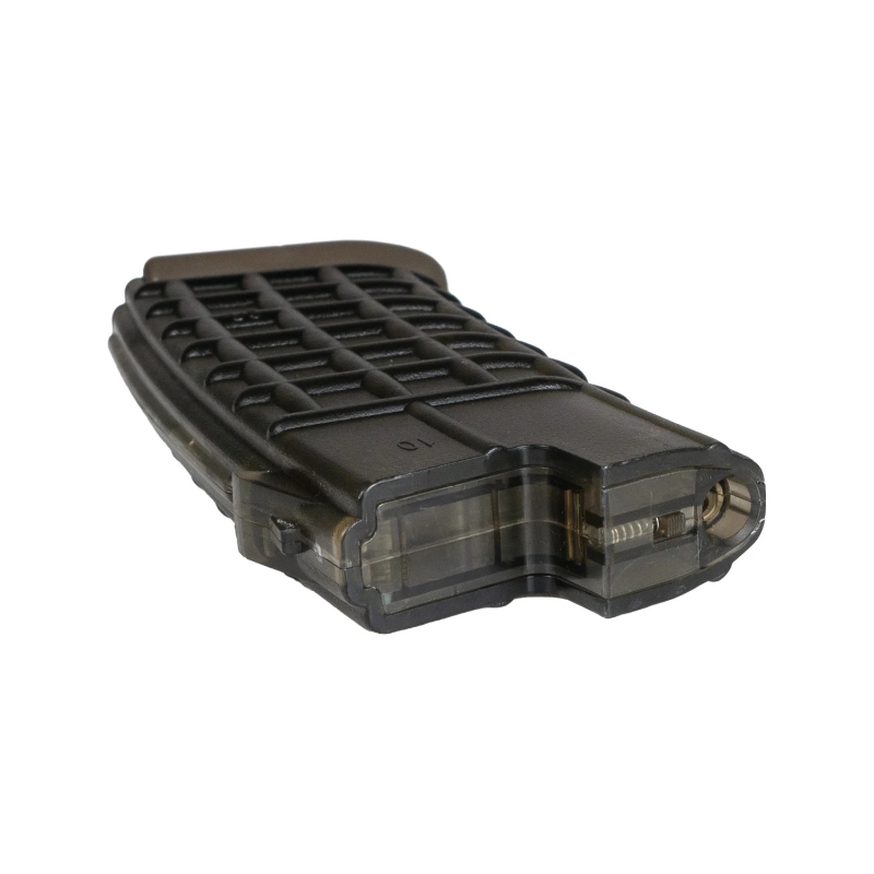Plastic mid-cap magazine for AUG series airsoft guns, including the Novritsch SSR77. Thanks to the strong feeding spring, it reliably feeds BBs even at very high rates of fire exceeding 30 BBs/s and easily handles heavier BBs of 0.40g and above.