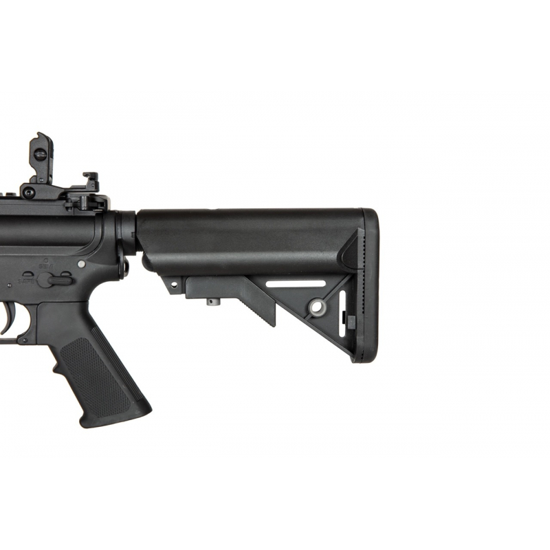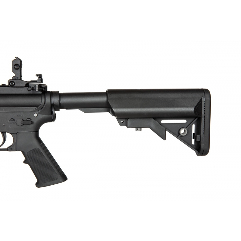 The airsoft AEG assault rifle M4 in the basic series FLEX™ by Specna Arms emphasizes lightweight nylon body while also offering top-notch construction and fit. The body is reinforced with fiberglass and is more durable than the common zinc alloys found in cheap metal bodies, which will be appreciated by both beginners and advanced players who prefer fast-paced action in the style of speedsoft, where every gram counts. This type of body can also be found on weapons like the CZ Scorpion Evo and the MP7.