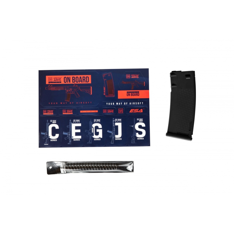 The gearbox is also reinforced and capable of operating with springs up to M120, as stated by the manufacturer Specna Arms.