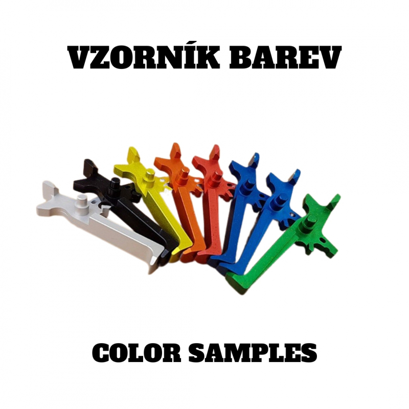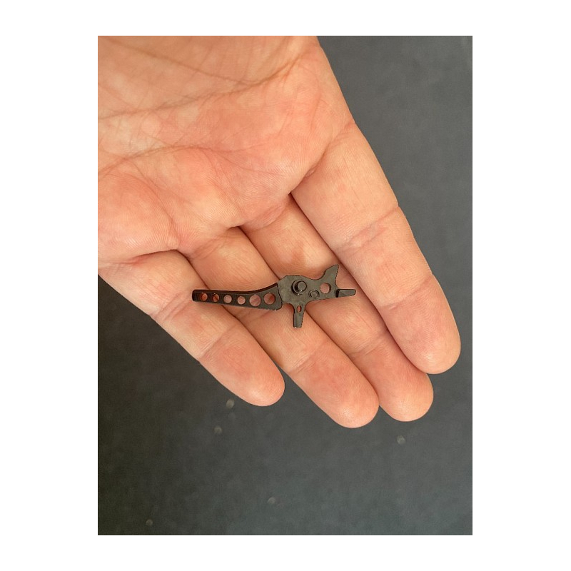 CNC trigger made of very strong aluminum EN AW 2007. It is designed for airsoft guns of M4 type and its clones. Trigger's response is very quick. Overall speed up is approximately 70%. Trigger's surface is decoratively anodized.