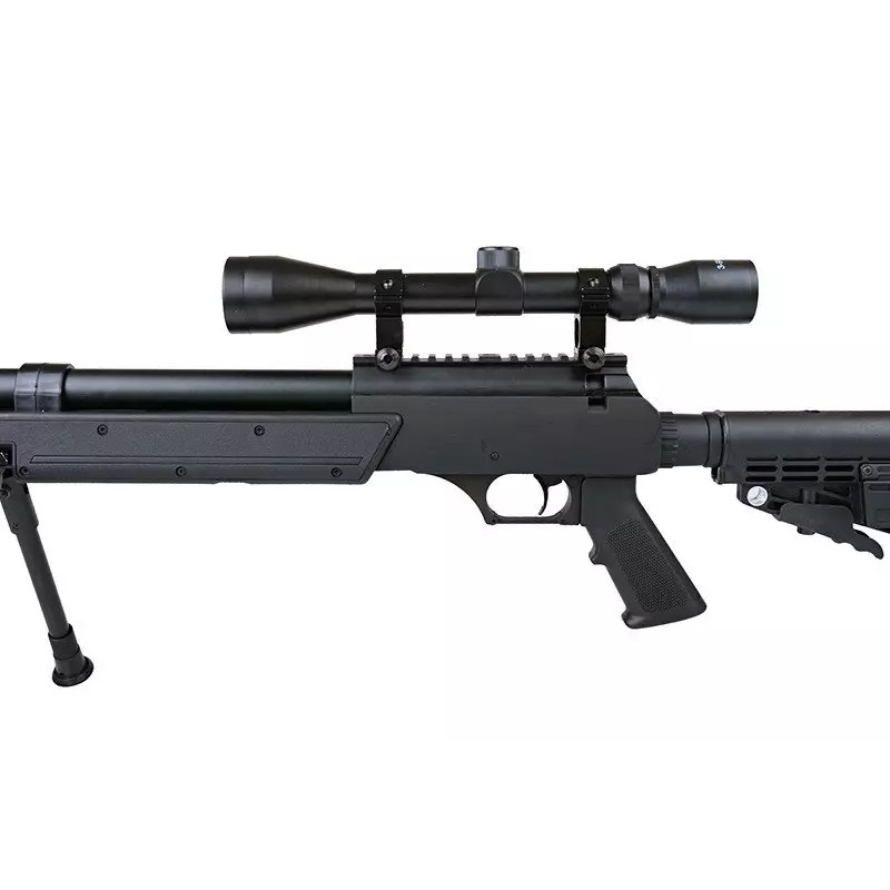 Powerful manual sniper rifle Well MB-13D. The breech and barrel is metal. The stock is retractable (M4/AR15 style) made of durable plastic. The gun comes with a metal folding bipod and a 3-9x40 optical sight with caps. The weapon is also suitable for left-handed shooters as it allows the bolt cocking lever to be moved to the left side.