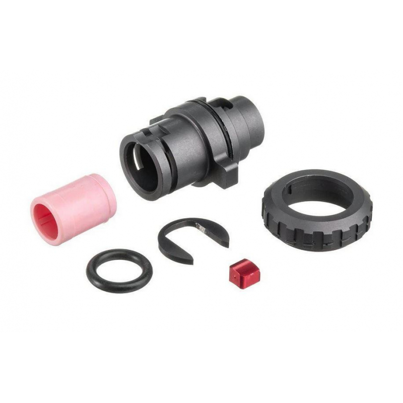 With a precise construction from CNC-machined aluminum, this chamber provides excellent durability and longevity. The hop-up pressure is adjusted via a large dial ring, ensuring secure fixation for stable accuracy. The aluminum pressing segment ensures uniform contact with the BB, resulting in greater range and reduced deviation. For optimal results, it is recommended to use Maple Leaf HOT SHOT GHK, COOL SHOT GHK, and WONDER buckings, which can be installed without additional modifications. For other GBB/VSR buckings, the positioning ridge on the side of the bucking must be removed for proper fitting.