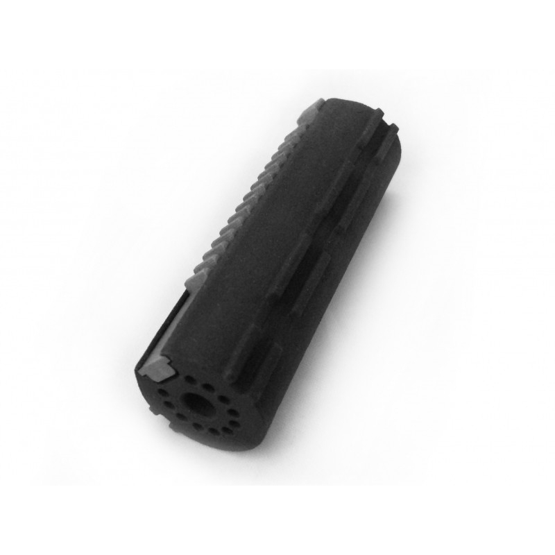 The piston contain of a very durable plastic body and a full metal teeth (14 pcs). The second tooth is remove to decrease the chance of pre-engagement by the sector gear. The front site of the piston has a light weight design, which makes a total weight only 14.95g. By reducing the weight, the piston's movement speed increases during the shot, thus increasing FPS and reducing the dynamic stress of the gearbox.