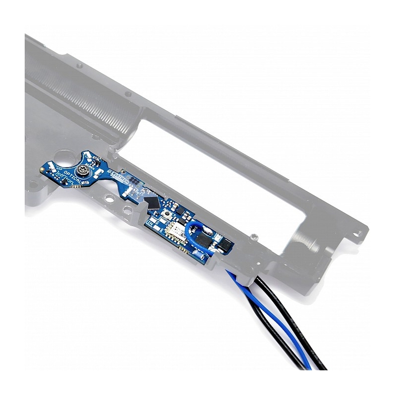 - On the board is input port with functions: 3rd burst, external trigger, AUG trigger, empty magazine detection, virtual magazine reload, etc. and output pads are for the hop-up chamber BBs illumination, powering electric magazine, flashlight, etc.