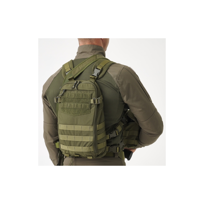 The Guardian Smallpack is a compact backpack with a capacity of 7.5 liters, designed primarily for use with the Guardian Plate Carrier, but it can also be worn independently. The interior is lined with soft fleece-like material (VELCRO hook-and-loop), allowing for the attachment of additional accessories like INSERT pockets as needed.