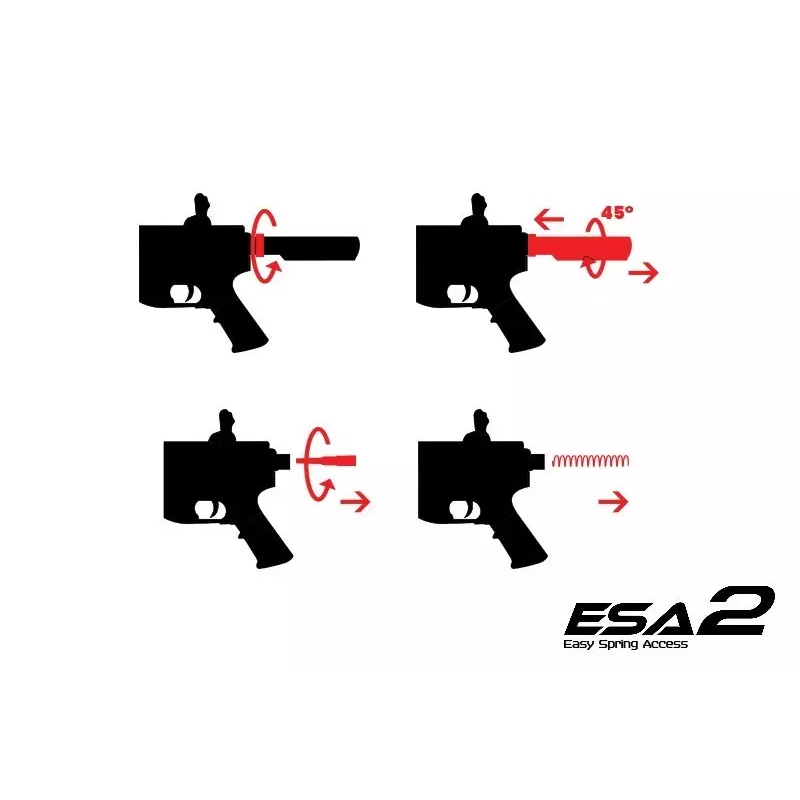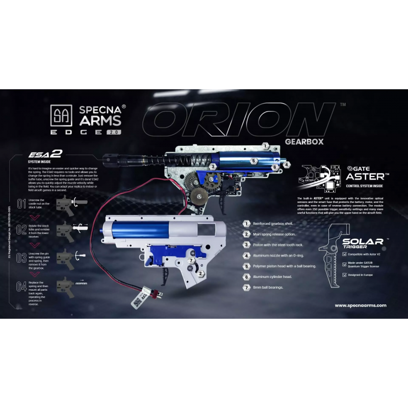 V dnešnej dobe je štandardom QSC systém ESA2 (rýchla výmena pružiny), ktorý umožňuje nainštalovať silnejšiu/slabšiu pružinu podľa vášho uváženia. Pružina sa dá vymeniť bez nutnosti špeciálnych nástrojov – stačí uvoľniť tubus a dostať sa priamo k QSC skrutke mechaboxu. Mechabox je navyše zosilnený a obsahuje nadštandardné vnútorné časti (ich zoznam nájdete nižšie v popise). Mechabox je schopný fungovať s pružinami do M120 vrátane (ako uvádza výrobca Specna Arms v popise mechaboxov ORION).