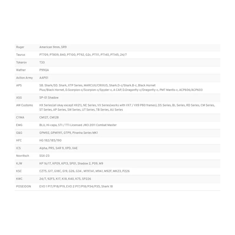Kompatibilné s viac ako 80 modelmi pištolí (vrátane Glock, CZ 75, Hi-Capa, Beretta, SIG a ďalších modelov vrátane airsoftových GBB a CO2 verzií).