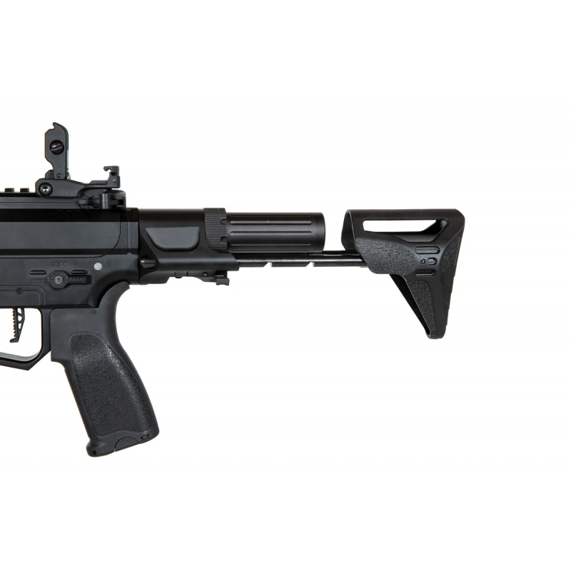 S nastaviteľnou kompaktnou pažbou typu PDW je táto replika skutočne minimalistická, len majte prosím na pamäti, že do PDW pažby sa vojdú iba malé batérie typu Stick (mini), väčšie batérie Stick (buffer) je možné použiť s predĺženým nástavcom pažby (nástavec nie je súčasťou).