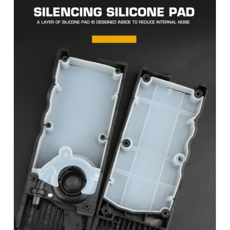 Model Silence vďaka pridanej vnútornej silikónovej vložke viac tlmí hluk, takže sa môžete bez obáv priplížiť k nepriateľom, bez toho aby bolo počuť, ako BBs cinkajú a hrkajú o steny nabíjačky.