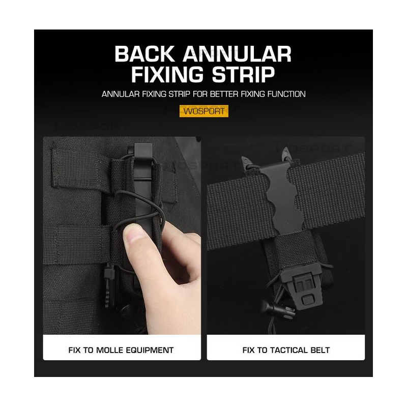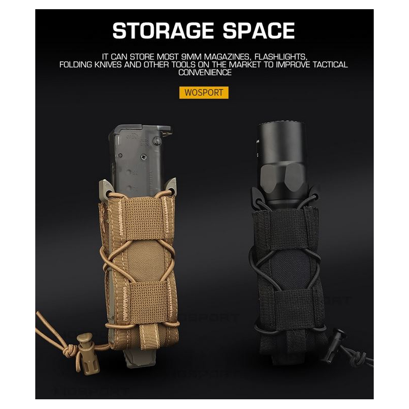 Tiger typ MOLLE sumka od značky WoSport je určená pre pištoľové zásobníky (Glock, Hi-Capa a pod.) alebo menšiu baterku. Sumka má veľmi dobré držanie zásobníka vďaka nastaviteľnej gumičke s brzdičkou. Ďalej má bočné plastové výstuhy, aby držala tvar pre jednoduché vkladanie zásobníka do prázdnej sumky.
