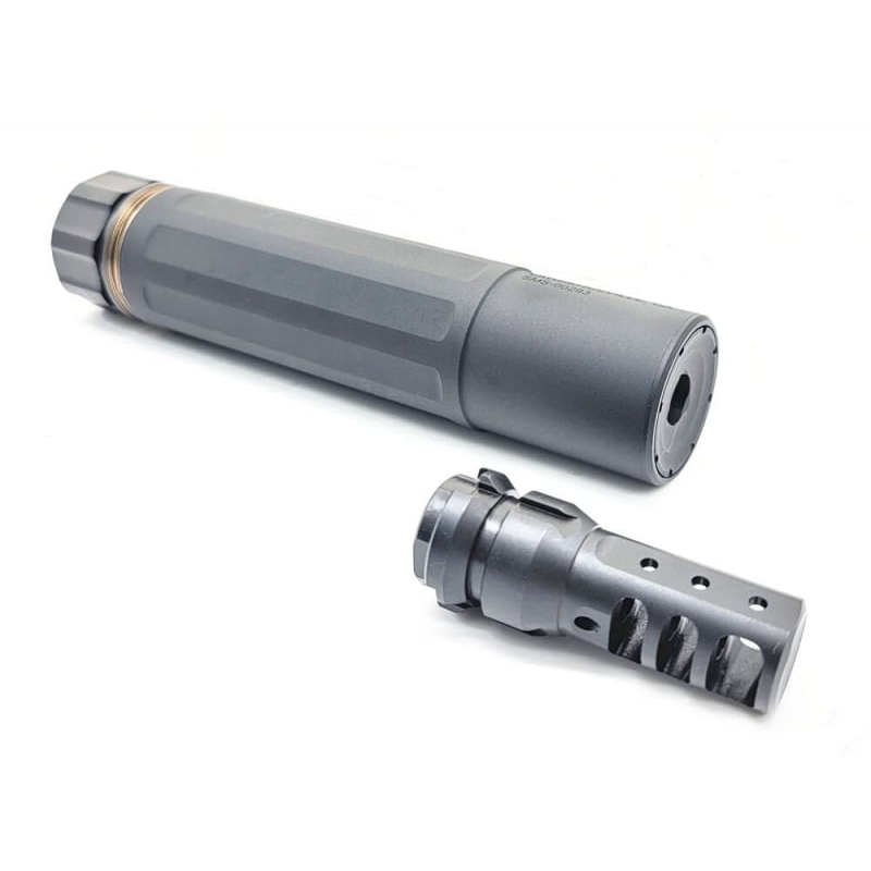 Telo tlmiča je vyrobené z odolného hliníka 6061-T6 s realistickým hlbokým razením a matnou povrchovou úpravou, pričom uzamykací mechanizmus je z ocele pre vyššiu odolnosť. Súčasťou balenia je aj tlmič výšľahu s QPQ povrchovou úpravou. Inštaluje sa na zbraň pomocou 14mm ľavotočivého závitu (CCW), na ktorý sa potom rýchlo a jednoducho upevní tlmič pomocou QD systému—stačí ho zasunúť do vodiacich drážok a otočiť základňou, čím sa pevne zaistí.